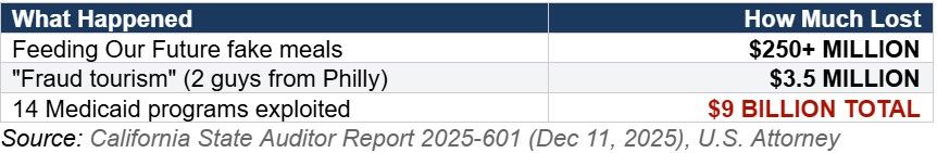 Source: California State Auditor Report 2025-601 (Dec 11, 2025), U.S. Attorney Minnesota (Dec 18, 2025)