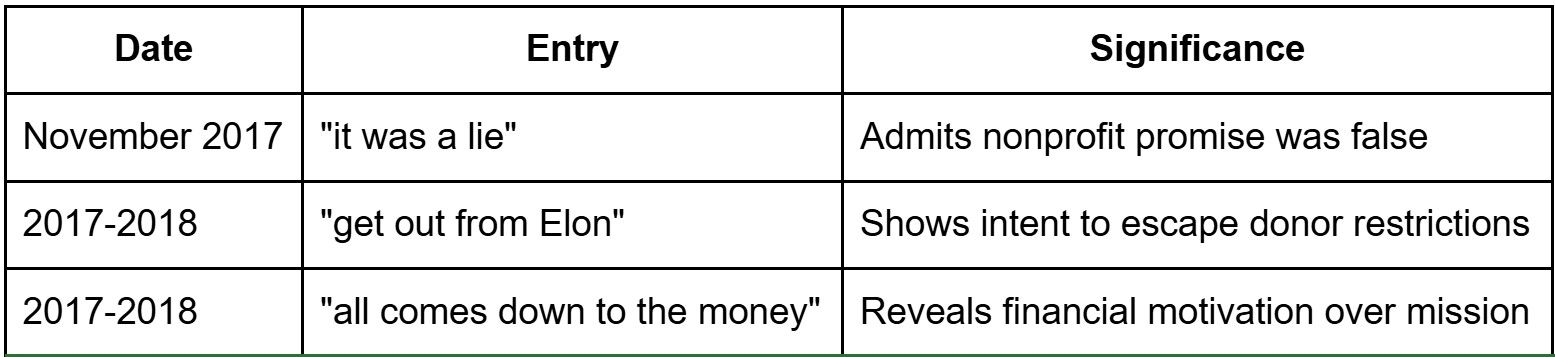 These weren't the musings of someone trying to honor a nonprofit mission. These were the calculations of someone trying to figure out how to escape the restrictions that came with Musk's money.