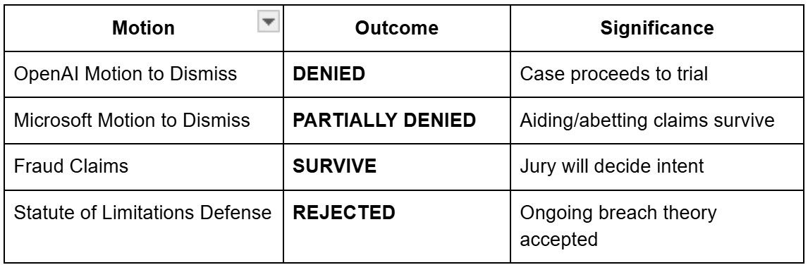 On January 15, 2026, a federal judge ruled that this case is going to trial. OpenAI and Microsoft threw everything they had at getting it dismissed. They failed.
