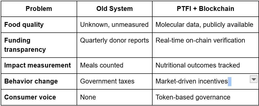 PTFI says: Food data should be open and publicly verifiable. Blockchain says: Financial flows should be open and publicly verifiable.