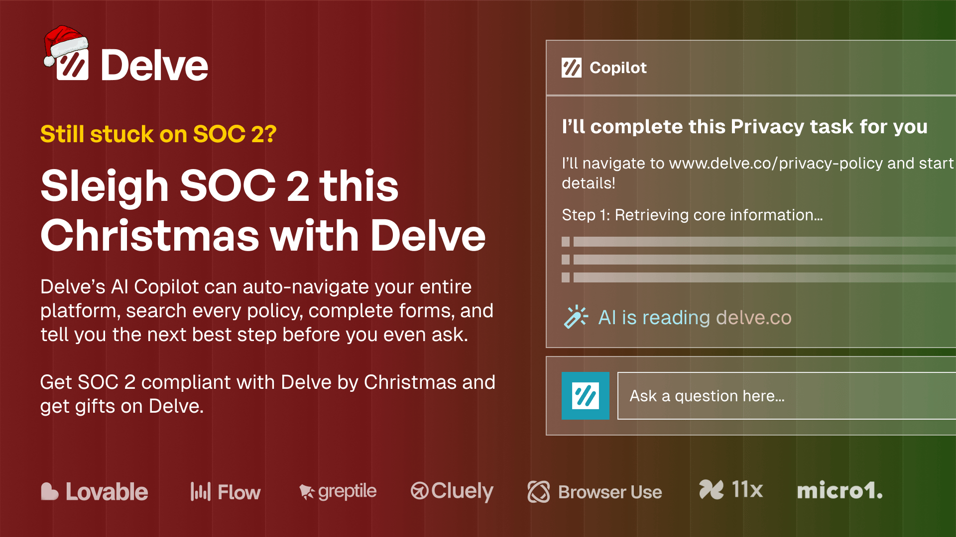 Delve’s Copilot reads your policies, completes privacy tasks, fills SOC 2 evidence, and navigates your workflow from start to finish.